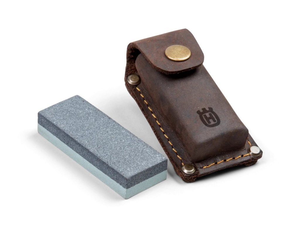 Ostřič na sekery a nože. Malý brusný kámen z karbidu křemíku na ostření seker s dvojí zrnitostí (hrubá a jemná) pro rychlé nebo jemné broušení. Lze použít jak na sucho, tak s olejem nebo vodou. Dodává se s koženým pouzdrem. Dodáván s koženým pouzdrem.