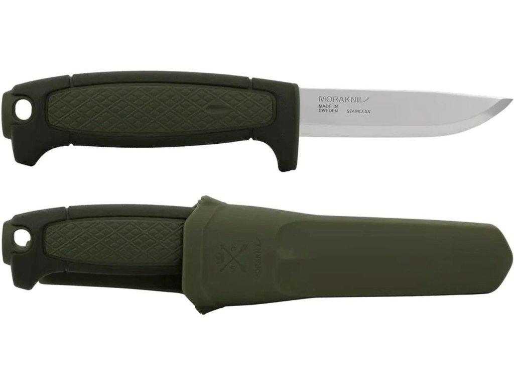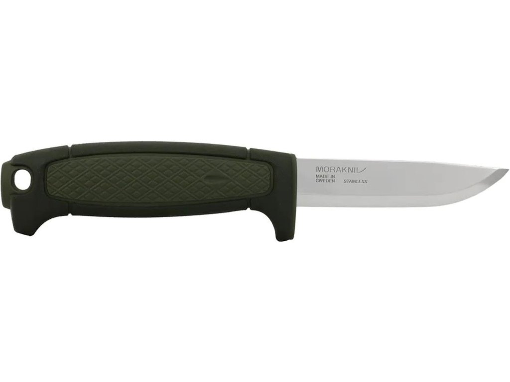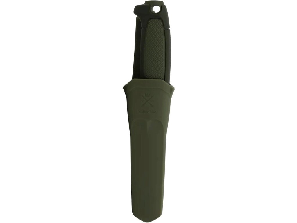 Rukojeť s tradičním vzorem Rhombus, známým z mnoha nožů Mora, poskytuje pohodlný, pevný a protiskluzový úchop. Plastová záštita chrání prsty před sklouznutím a v zadní části rukojeti se nachází otvor pro uchycení karabiny, šňůry nebo paracordu.