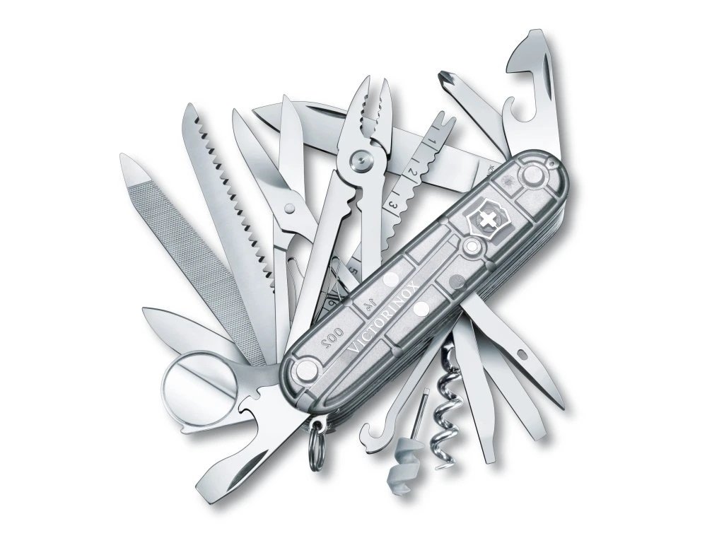 Funkce | Pilník, Nůžky, Otvírák, Šroubovák, Pilka, Vývrtka, Křížový šroubovák, Kleště, Háček, Lupa |